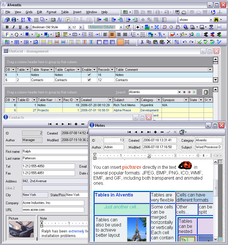 Alventis is a Universal Information Manager that can record all your valuable data: free-form rich text notes, contacts, tasks, inventory, budget, employee records, resumes, sales leads, real estate records, personal collections, and so on. The number of table formats and data-entry forms is unlimited. Full-text indexing ensures that your searches are lightning-fast. Banded reports are created with drag-and-drop ease.