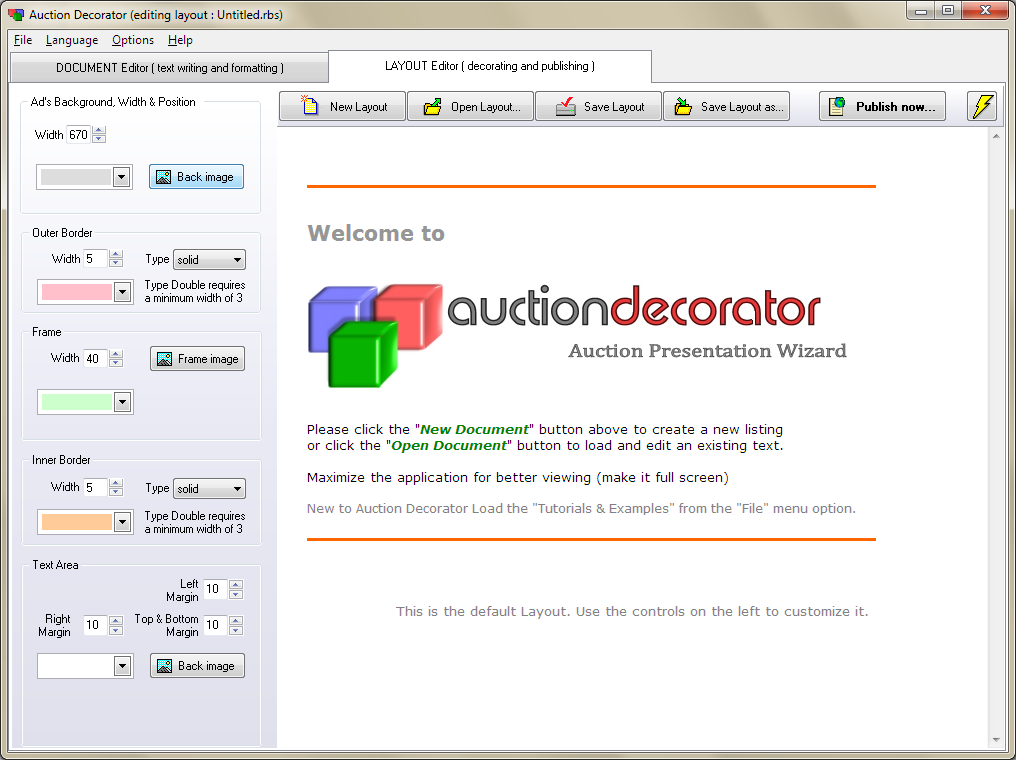 Auction Decorator is an application for composing, decorating and publishing eBay® Auction listings to the Internet.
