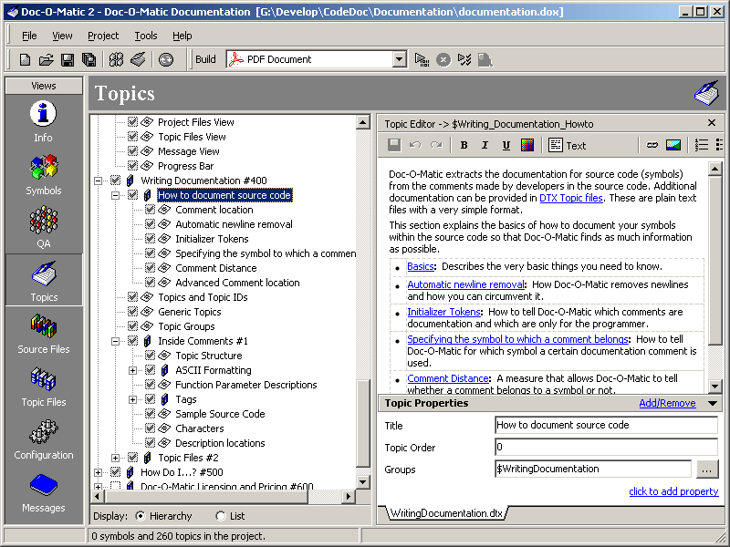 - Doc-O-Matic helps you manage your source code by providing a class hierarchy visualization tool, a flexible report feature and a graphical documentation QA tool.