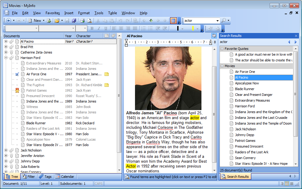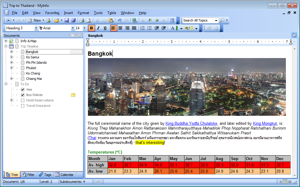MyInfo's clean, intuitive interface gives you immediate access to crucial files. You can open and work with multiple files simultaneously. MyInfo has both a simple built-in search function, and a powerful search system that lets you build complex queries. It's easy to organize topics for efficient storage and retrieval. Text styles let you create a professional, consistent look and feel to all of your documents. The built-in web browser lets you surf your collection of web resources, without having to run an external web program.