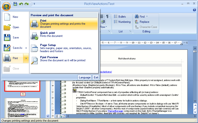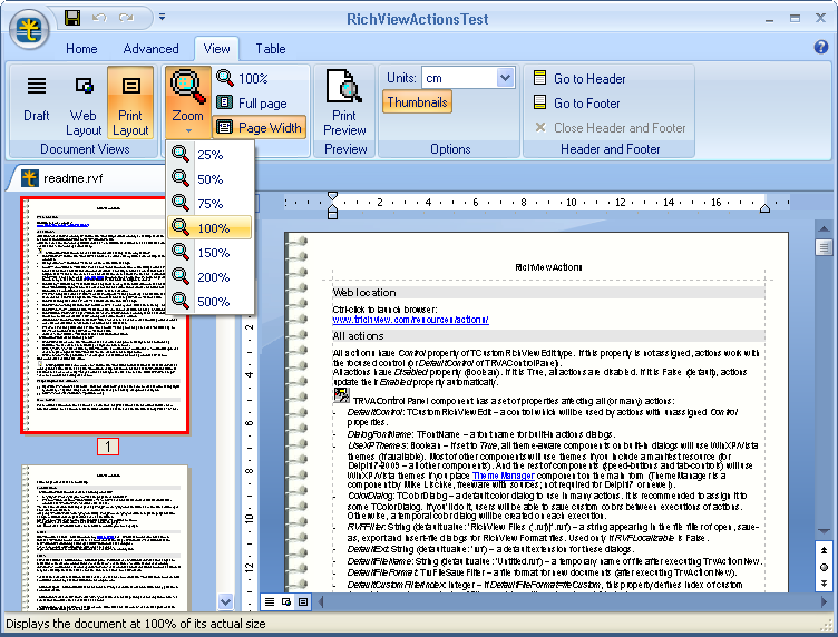 - 18 new actions designed for ScaleRichView (for printing, previewing, changing page properties, switching view modes, zooming, editing footnotes and endnotes, etc.)